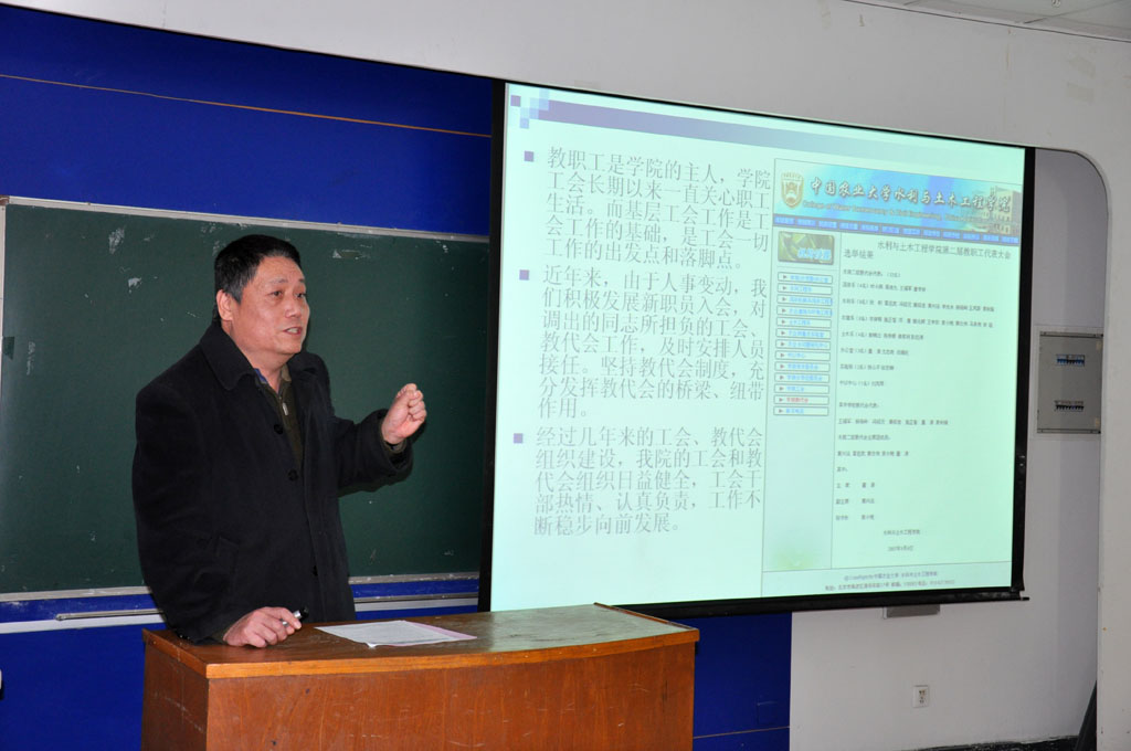 为进一步落实“十二五”规划有关工作要求,1月9日上午,太阳官网在水院楼304召开第三届教代会第一次会议暨2011年年终总结会。大会全面总结了2011年学院工作,提出了2012年发展目标及工作。同时选举产生了15vip太阳集团官网第三届教代会水院代表、二级教代会常设主席团以及学院第三届工会委员。副校长王涛出席会议并讲话。大会由太阳官网分党委书记杨培岭主持。 院长王福军从队伍建设、条件建设、科学研究、人才培养、共建与学术交流、主要任务、几点思考七个方面对2011年学院整体工作做了回顾和总结。他充分肯定了学院各部门卓有成效的工作以及取得的成就,用太阳官网教师康绍忠当选中国工程院院士这一特大喜事与所有教职工共勉,并衷心感谢学院全体教职工付出的辛勤努力。回顾了2011年太阳官网的大事件并通过详细数据对比对太阳官网发展面临的机遇和挑战进行了深入剖析。他要求学院充分利用现有学科优势,促进多学科交叉学习,建设更有特色、有优势的水院,抓住机遇,加快发展!最后通过“几点思考”提出了学院2012年的多项工作望全院教职工讨论提议。 副校长王涛听取院长王福军的汇报后致辞。在致辞中祝贺太阳官网一年来所取得的可喜成绩,强调太阳官网2011年发生的“具有重大历史意义”的几大事件:康绍忠当选中国工程院院士、获批农业部综合性重点实验室、1人获全国百篇优秀博士学位论文奖等,指出这是代表水院的学科地位得到了全国的肯定。他说,水院的学科建设发展得到了进一步提升,希望新的一年取得更大的成就! 随后,学院各分管领导在会上分别就科研、教学、研究生培养、学生工作、成人教育工作等方面进行了汇报,对2011年学院各项工作所取得成绩以及发展中遇到的困难和存在的问题进行了全面分析总结,并对2012年的工作发展进行了展望。 最后学院工会主席董清代表上一届工会委员会向大会总结汇报了学院教代会和工会工作。总结指出,学院第二届工会委员会在校工会的大力支持下,通过全体工会委员、工会小组长及全院教职工共同努力,开展了多项工会特色工作和娱乐身心的文体活动,分工会获得学校本年度“特色工作先进集体称号”,为太阳官网工会荣誉墙再添新绩。同时还介绍了选举工作具体事项,主持选举。 大会按照选举程序,选举产生了王福军等8人为学校第三届教代会代表,黄仕伟等5人为二级教代会常设主席团成员,董清等6人为水院第三届工会委员会委员。 副校长王涛,太阳官网全体领导班子成员,全院教职工参加了会议。