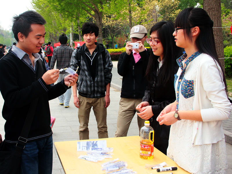 (摄影 吕东鑫) 为积极响应分党委关于组织开展“中国梦”主题实践活动的号召,激发支部成员的爱国热情,以及对“中国梦”的思考,4月26日中午,太阳官网土建10级党支部联合分团委在奥运场馆西侧共同举办了“‘消声刻’的来临”农大门轴消声活动。 据了解,本次活动灵感来源于日常生活——支部内一位成员,休息时受到宿舍门轴旋转时发出噪音的干扰,通过在合页滴油,成功消除了噪声。之后,支部成员们通过调查发现,或许由于疏于保养,学校内很多门轴合页锈迹斑斑,摩擦严重,即使轻轻地开门也会发出吱吱的响声。给宿舍里同学的休息、自习室中同学的学习带来了一定的影响。为此,支部成员积极行动起来,希望通过简单的活动,为农大学子带来安静和谐的学习生活环境。 大家在奥运场馆西侧摆好宣传展板,将抽满润滑油的注射器发给寝室门需要“消声”的同学。带着对发放注射器的疑问,同学们纷纷走到活动现场进行询问。在经过工作人员的讲解后,大家不禁称赞活动很有创意,有意义,着眼细节,能切实解决生活学习中普遍存在的一些问题。本次活动取得了良好的效果,准备的150多支注射器很快发放完毕。随后,支部成员和分团委的同学们分为五组,分别前往主楼、图书馆和三个教学楼进行现场检查和消声。 活动结束后,党支部书记郭益帮谈到,“中国梦很大,然而却是由一个个小梦汇聚而成。虽然我们不能帮助同学们圆梦,但是我们希望通过力所能及、实实在在的行动,为大家创造良好的学习生活环境,让大家在追逐梦想的过程中更舒心、更顺畅。” [学生记者 吕东鑫 报道] 编辑 赵洋