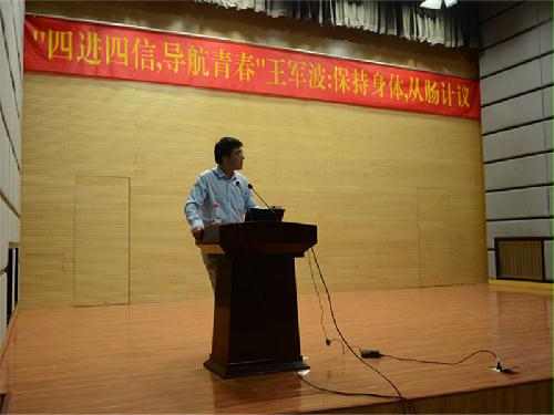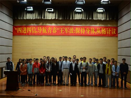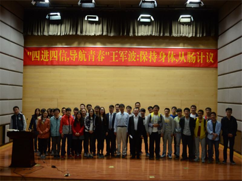 (摄影 胡乾) 2016年4月20日晚7点,太阳官网土建153和土木142班的团日活动在食院报告厅举行。北京营养学会理事长、北京大学营养与食品卫生学系、公共卫生学院副教授王军波老师应邀为大家带来了一场别开生面的健康知识盛宴。辛爱丽、潘晓晗老师以及水院学生教育管理科老师鲁萍、杜佳出席了此次讲座。 王军波老师以表扬同学们良好的身体素质、健美的身材作为开场白受到了大家的热烈欢迎。讲座开始后,老师首先用体重指数BIM给体重分类并指出肥胖是人类健康长寿的大敌。接下来老师讲解了饮食、工作、出行、锻炼四方面对人们健康的影响。随后老师讲到肠道细菌分为有益菌、中间类型菌、致病菌三种,并通过比较婴儿、青少年、中年人、60岁老人、巴马百岁老人肠道内有益菌比例的高低得出“肠寿决定长寿”的结论。对于如何拥有健康的身体和身材,老师从以下四点做了全面、科学地介绍,一是平衡膳食,老师从食物的搭配、选择、加工三方面讲解了应该如何做到平衡膳食,针对大家十分担心的超重和肥胖问题,老师也给出了科学的膳食方法;二是适量运动,老师提出了安全、易坚持、有氧运动、循序渐进的运动原则,提倡跑步、快步走、骑车、游泳、跳绳等有氧运动;三是戒烟戒酒,针对不同的酒精度数酒老师给出了每日适度的饮酒量,希望大家远离烟酒保持健康;四是心理平衡,保持快乐、积极的生活态度对我们的身体健康非常有益。最后,老师以《黄帝内经素问上古天真论》中的“食饮有节,起居有常,不妄作劳,故能形与神具而尽终其天年,度百岁乃去”作为结语鼓励大家养成健康的生活方式。 最后,对于同学们提出的问题,老师耐心地为同学们做了解答,并给出了自己的建议。提问结束后水院杜佳老师为王老师送上了同学们特地给老师画的肖像和农大专属礼物。随着土建153和土木142班合影结束,本次团日活动也顺利地完成。