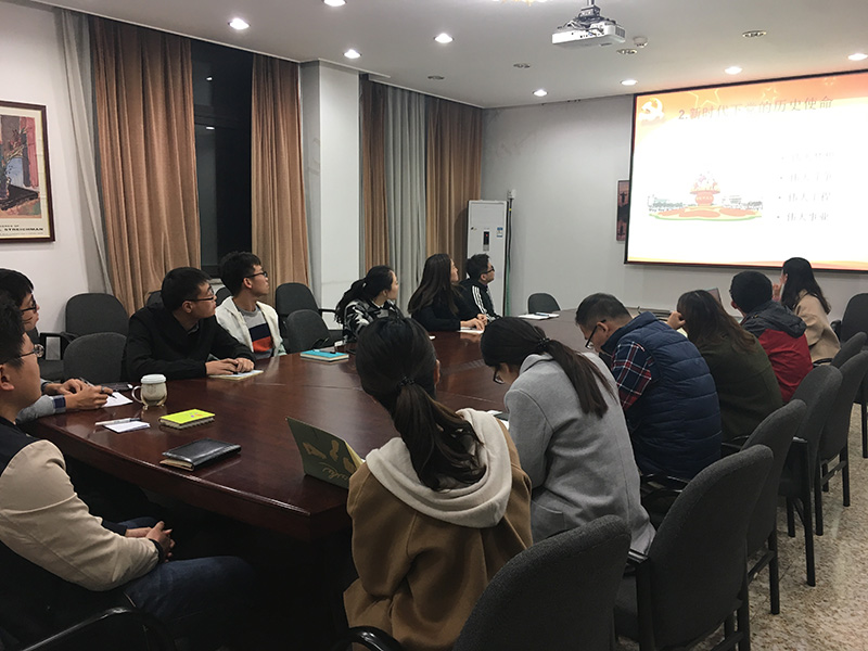 11月2日晚,流体研究生第一党支部在中以楼二层会议室召开“我学十九大”专题组织生活会,会议由党支部书记张驰也主持。 张驰也首先带领大家学习了十九大报告,向全体党员传达了学院党委对基层党支部深入学习贯彻党的十九大精神的安排部署,对自己学习十九大精神的体会和感受进行了发言交流。支部组织委员黄婉茹向大家分享了前往西柏坡革命圣地参观学习的心得体会,介绍了西柏坡革命历史及精神、展示西柏坡中共中央旧址及纪念馆图片、讲述革命歌曲背后的故事等,使支部党员深受感染,被西柏坡的革命历史和革命精神所激励,立志不忘初心,牢记使命,为党和国家多做贡献。 随后,与会党员纷纷发言表达自己学习十九大报告和精神的理解与体会。郭苗就自身如何在新时代潮流中做一个优秀的共产党员发表了自己的看法,她认为作为研究生,国家未来建设的参与者,应该更好地学习专业知识,才能在未来积极投身到祖国的建设中发挥自己的力量。陈孟征针对承包经营权的界定、经营主体、经营方式与管理制度等方面发表了自身对乡村振兴战略丰富内涵的理解。王超越就当代研究生党员的青春与梦想展开讨论,提出“要用党的理论武装思想,用专业理论践行使命”。大家还对新时代下党的历史使命、习近平新时代中国特色社会主义思想等内容进行了讨论,一致认为要对新党章和习近平总书记重要讲话进一步认真学习,争做一名优秀的共产党员。 张驰也最后总结发言,希望全体党员不忘初心,牢记使命,脚踏实地,在实现中国梦的过程中放飞自己的青春梦想,在为人民利益奋斗的道路上不懈努力,为建设社会主义强国奋斗终生。 审核 黄振翔