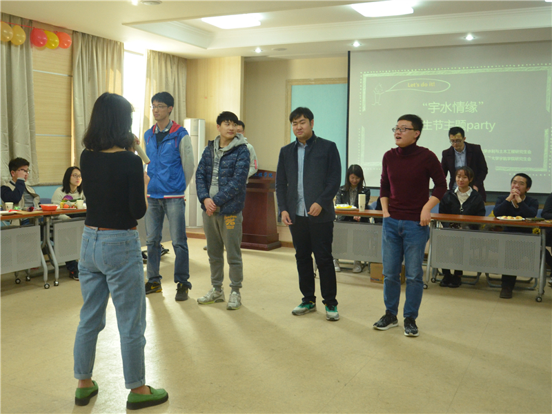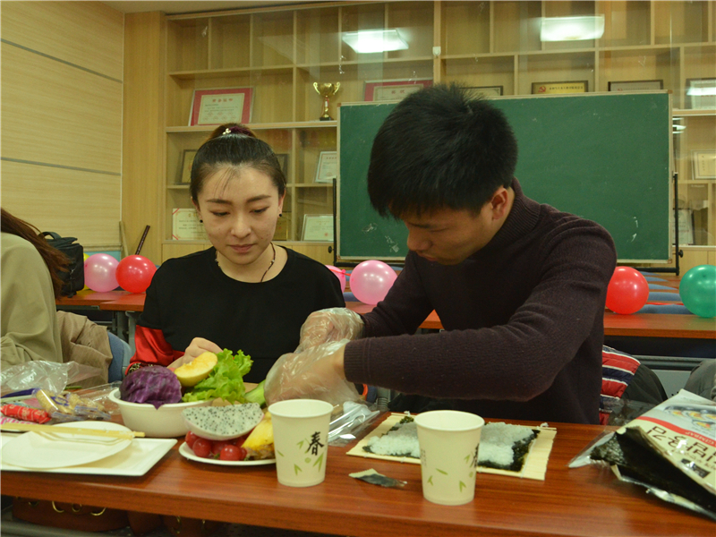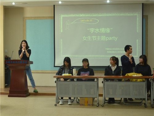 (摄影 赵萍楠) 为了庆祝3月7日女生节,水院研究生会特意举办了一系列活动。2017年3月7日,水院研会的同学们买了玫瑰花,为水院楼和中以楼的女老师们送去节日的祝福。3月12日下午3点,研会又在水院楼304举办了“宇水情缘”女生节主题派对。北航的宇航学院研会主席王英帆带领男生,中国农大的水院研会主席郭晓旭带领女生参加了这次派对。本次活动由水院研会主席郭晓旭主持。 在欢声笑语中,主题派对开始了。首先,同学们通过抽签决定了自己的搭档。确定搭档之后,派对气氛变得十分活跃,大家通过互相交谈增进了对搭档的了解。接下来,活动进入了游戏环节。大家各自牵着左右同学的手进行游戏。游戏中,主持人不时的恶作剧使搭档们擦出了火花,屋内的气氛也变得更加欢快。简单的游戏过后,开始了派对的第二个节目“便当大比拼”。每个组的搭档们都充分发挥自己的想象能力,合作动手制作属于自己的创意拼盘。他们一个切蔬菜,一个摆拼盘,分工协作,默契十足。在男女生的协调合作之下,一个个精致独特的拼盘出现在了桌子上。通过这个环节,搭档们的了解和感情也在一步步加深。拼盘制作完毕后,评委们逐个品尝并进行投票。投票期间,大家使出浑身解数拉票,场内气氛更加欢快。投票结束后,便开始了第三个环节“百科知多少”。主持人抛出了一个个稀奇古怪的问题来让大家回答,答对了题后就可以加一分。男生女生们互相询问,一起思考,趣味无穷。由于题目都比较古怪,同学们闹了不少笑话,教室里的气氛再度升温。 最后,评委们计算了每个同学的分数,选出了男女生的前两名进行奖励。下午5点40分,本次女生节系列活动圆满结束。通过此次活动,同学们不但度过了一个愉快的周末,而且加深了对彼此的了解,进一步增进了彼此的友谊。