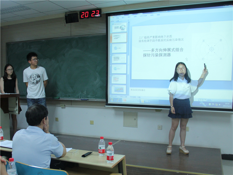 (摄影 马硕) 5月23日晚6:30,第五届全国水利创新大赛选拔赛答辩会在三教207成功举行。比赛指导评审委员会主任杨培岭,水利系教师王素芬、陈明洪、苏艳萍、熊云武、徐旭,流体系主任肖若富,教师唐学林、黎耀军、丁涛老、杨魏在此次比赛中担任评委。分团委常务副书记杜佳也出席了此次答辩会。 第五届全国水利创新大赛由中国水利教育学会、教育部高等学校水利学科教学指导委员会主办,希望能通过比赛来培养大学生的协作精神、创新意识和实践能力,为我国水利事业建设和发展培养一批创新型人才。第五届全国大学生水利创新设计大赛的主题为“水+”,利用多种技术围绕“水+生活”、“水+生态”、“水+能源”、“水+节约”等进行实物作品的创新设计与制作,秉承可持续发展理念,注重节水优先、绿色生态、人水和谐及新技术的应用。水院共有13支队伍参加了今年的校内选拔赛。 会议开始,由主持人介绍比赛规则和各位评委老师,随后开始正式答辩。答辩过程中,选手需在5分钟之内展示成果,然后进入评委老师提问环节。答辩会上参赛选手的作品创意十足,管路堵塞检测及预警装置,抗堵塞低成本水泵流量监测仪,动节水洗手机……每个作品都有自己的特色,都充分切合了节水优先,绿色生态的主题,让评委和观众耳目一新。评委老师在对选手们的作品表示赞赏的同时,也为对参赛作品的进一步改进给出了宝贵的意见。 答辩结束后,杨培岭对此次答辩会进行了总结。他先强调了作品的创新性、特色性、可行性。同时,他赞赏了此次参加比赛的各支队伍的努力和创意,表示此次作品在质量和创意上都强于往届作品。最后,此次答辩会在愉快的氛围中落下帷幕。