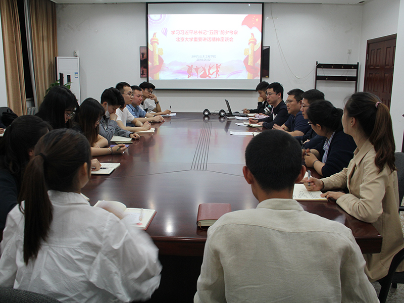 (摄影 胡乾) 5月2日,习近平总书记到北京大学考察并发表重要讲话。当晚,水院分党委组织辅导员、部分青年学生党员、团学组织学生骨干等召开座谈会,学习交流总书记的讲话精神,反响热烈。水院党委书记沈立峰、副书记兼副院长华博出席会议。 座谈会上,师生共同观看了习近平总书记考察北京大学的新闻播报,大家结合自身工作学习实际,话感悟、谈体会。 沈立峰表示,学院广大教师要认真领会学习习近平总书记视察北大重要讲话精神,发挥立德树人的主导作用。他强调,总书记要青年学生“立鸿鹄志、做奋斗者”,充满了对青年学生的殷切期待。“总书记在15岁时就有了独立思考能力”为大家树立了榜样。水院学子要不畏困难,脚踏实地,认真学习掌握专业知识,不断打磨真本领,努力成长为中国特色社会主义的合格建设者和可靠接班人。 华博谈了对总书记讲话中“广大青年学生生逢其时”的理解。国家的发展关系到每一个人,青年学子的进步也离不来党和国家事业发展的宏大背景,同学们一定要有坚定理想执着信念的自信,像总书记所期望的那样成长成才,各级学生骨干更需要找准定位,主动作为,成为青年学生中的榜样。 辅导员、学生教育管理科科长黄振翔表示要牢记总书记“教育者先受教育”的教诲,努力在日常工作中践行好围绕学生、关照学生、服务学生的职责,更好地担当起学生健康成长指导者和引路人的责任。 水利研究生第四党支部书记许尊秋在座谈时表示,党员骨干要以身作则,带动支部党员建设好党支部,进而影响到更多青年学生追求伟大梦想,让基层党的建设保质保量;农建151班郝泽同学分享了他学习马克思主义理论文献典籍“从懵懂到逐渐明朗”的感受,以及学习带给他对人生观、价值观、世界观的深入思考,积极投身乡村振兴战略生动实践的灵感;分团委学生副书记程亮表示,总书记讲话激励自己树立更加远大的理想抱负,在创新实践中一点一滴积累,让自己的视野上升到与国家发展需要的角度去思考未来发展;大一同学郭怡心表示作为低年级的同学,既要脚踏实地打好专业基础,又要关心关心国家,关注世界,知行合一,不负总书记讲话中的要求与希望。 座谈会由水院分团委书记王胜男主持,学院全体辅导员共同参加了学习交流。 水院教师也收听收看了总书记视察的新闻报道,主动思考交流习总书记的讲话精神。学院党委青年委员、土木系教工党支部书记丁敏,水利系副主任韩宇一致认为,作为一名高校青年教师,当时刻牢记总书记教诲,以加强自身素质、提高业务水平为已任,积极配合学校学院相关工作,为国家人才培养以及一流大学建设贡献自已的力量。农建系教工党支部书记奚雪松、流体系党支部宣传委员陈鑫表示,创建一流学科必然要加强我们自身的科研能力,对科研方向的深化中更要瞄准国家与地方经济社会发展需求,找准定位。院长助理张立伟谈到,工作中一定要坚持正确政治方向,加强自身学习和自我教育,提高自我修养和综合素质,担当好立德树人的神圣使命。学院专职辅导员也在集体收看新闻报道后交流了体会,相伴青年成长成才既是使命,也是追求,今后要更加努力地为同学们的发展进步助力。
