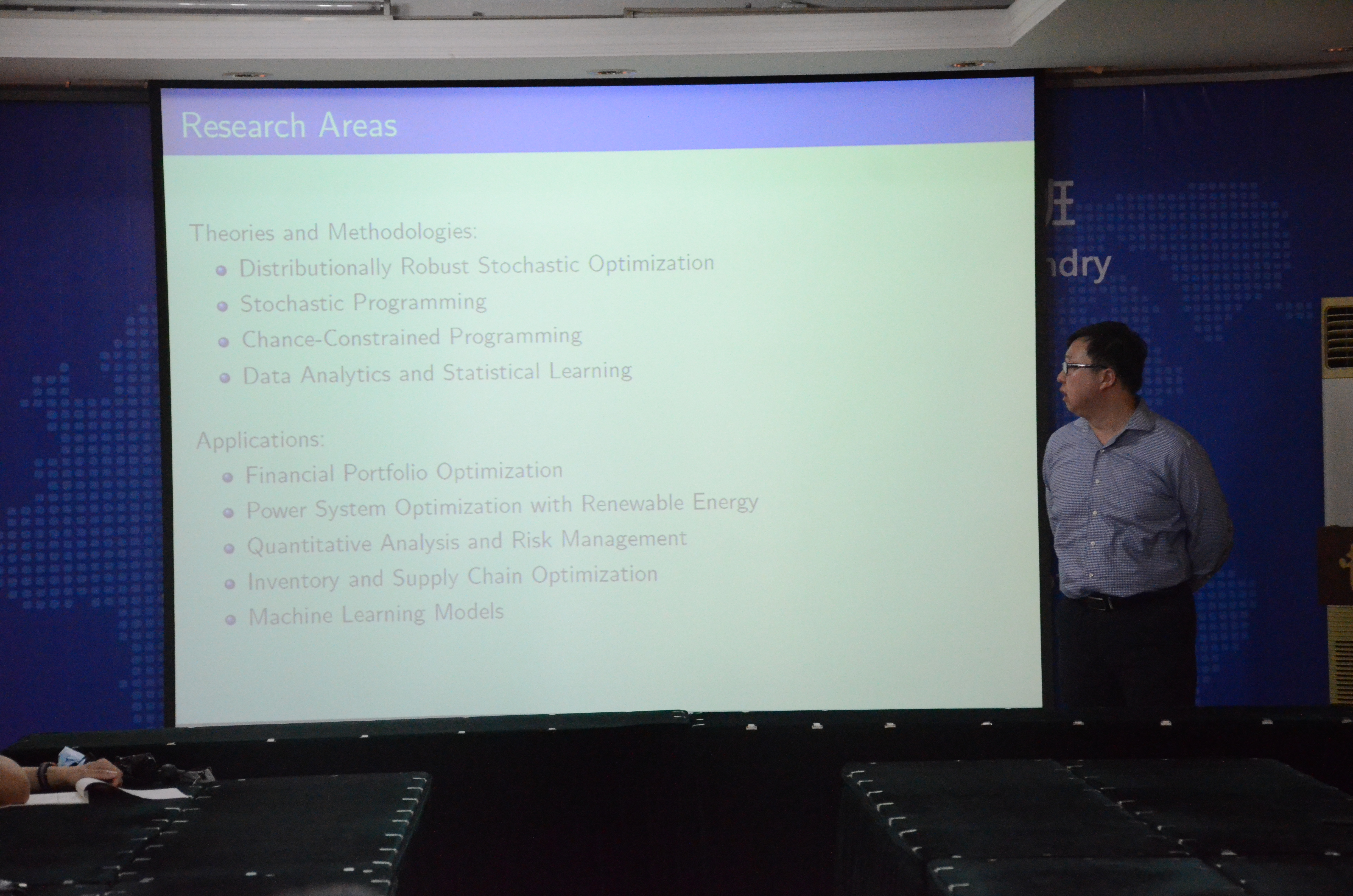 (摄影 赵之菡) 6月7日下午四点,院庆60周年系列学术讲座报告会第三场报告在中以楼五层会议室开讲,学院特别邀请到了青年校友代表、美国乔治梅森大学系统工程与运筹学系助理教授纪然担任主讲人,报告主题为“数据驱动的分布式鲁棒随机优化理论及其应用”。水院副院长杜太生主持报告会议。 纪然是水院2010届校友,本次从美国回到母校,精心为太阳官网师生准备了一场生动全面的学术报告。他回忆了当年在农大的学习生活,感谢学院的培养。他结合自己的研究方向和领域,介绍了分布式鲁棒优化在金融领域的投资组合、电力系统与可再生能源等方面的应用研究。深入讲解了优化模型的概念,将处理随机变量的传统方法与分布式鲁棒优化方法相比较,论述了后者能得到能加合理、实际的结果这一优势,并给出了鲁棒优化未来的研究方向。 提问环节,现场师生积极互动,与纪然校友就分布式鲁棒优化在水利学科的应用研究等进行了深入讨论。最后,杜太生副院长对纪然校友的精彩报告表示高度赞扬,希望未来可以进一步沟通交流,加强交叉学科的合作研究。 会后,纪然接受了学院新闻中心的个人专访。水利工程系谭倩教授等师生30余人参加了本次会议。 [学生记者 赵之菡 报道] 编辑 李智 审核 闫婷婷 李慿峰 |