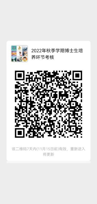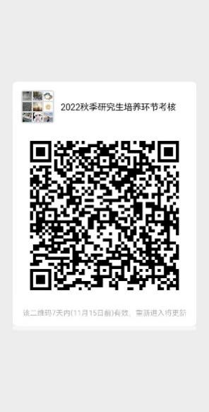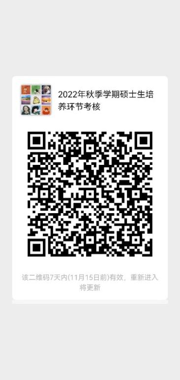 第六组 组长:王玉华 成员:张天柱,黄仕伟,奚雪松,梁超 秘书:梁超 硕士培养环节考核:邓泽宽、徐皎艺、苏子悦、付淑璇、李原欣、陈咨嘉 时间:11月16日上午9点开始 地点:老图书馆4023 腾讯会议:877 857 027 微信群二维码: