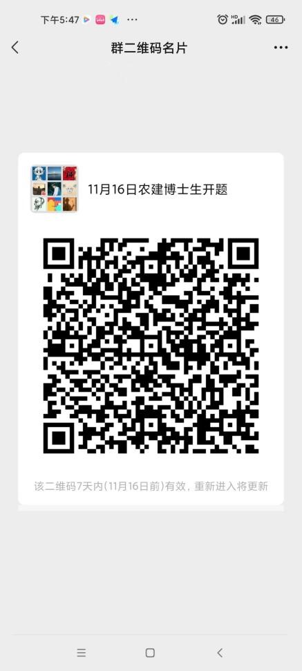 第八组 组长:施正香 成员:滕光辉、王朝元、袁小艳、李浩、梁超 秘书:王新锋 硕士培养环节考核:韩非、祝鹏飞、马晓春、曹晓洁、党昊昱、孟奎、肖超乐、张煜、曹鸿博、邓慧祥、郭嘉鑫、王毓麟、温磐、戴雨珊、胡博、肖攀、庞凯龙、宫津萌 时间:11月21日8:30开始 地点:水院楼304会议室 腾讯会议:478-326-175 微信群二维码: