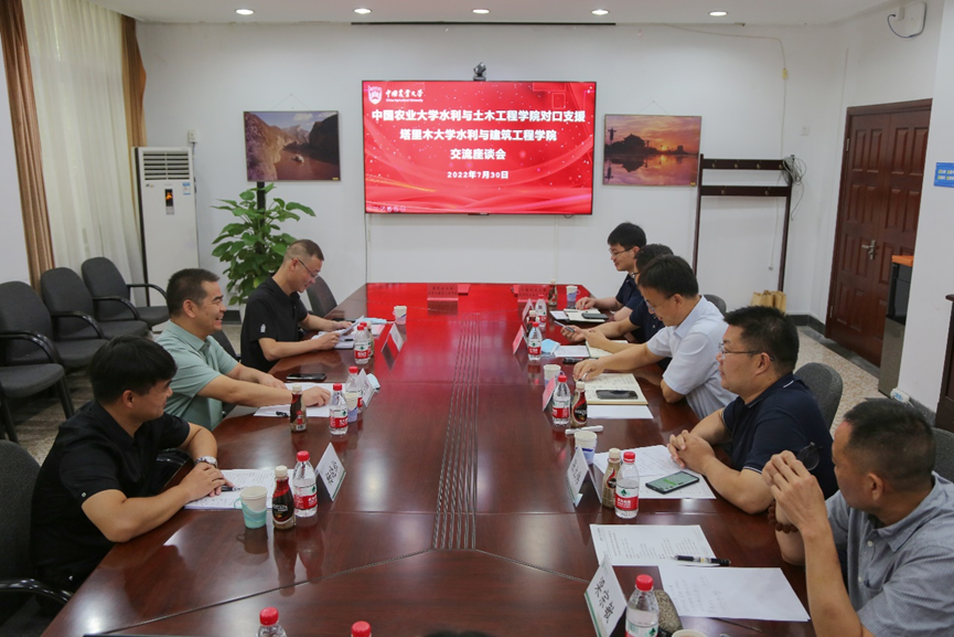 李云开对王兴鹏一行的到来表示热烈欢迎。他指出,两个学院之间的对口支援工作已有十余年,双方在博士生联合培养、本科生交流、师资水平提升、科学研究与社会服务、基地建设等方面进行了广泛而深入的交流与合作,建立了良好的合作基础,取得了显著成效。他表示,在新一轮的对口支援工作中,学院将结合塔里木大学水建学院具体的需求,集全院力量,重点通过“慕课西行”、多层次教师交流合作、项目协同攻关、基地共建共享等措施,在党建引领下,在人才培养、教育教学、学科建设、科学研究、社会服务等方面,开展更加广泛、更加深入和更有成效的交流与合作,不断提高对口支援的广度、深度与高度,力争做出新的更大贡献。李云开还详细介绍了学院的基本情况,学科建设的特色做法及未来思考,提出了后续对口支援的具体措施与建议。