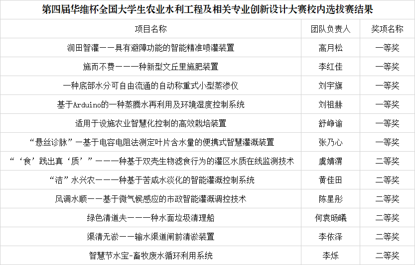 第四届华维杯全国大学生农业水利工程及相关专业创新设计大赛校内选拔赛于2024年7月4日举行。太阳官网共报名12个项目,经资格审查及评审遴选,选拔出6个项目晋级国赛。现将选拔结果公示如下: